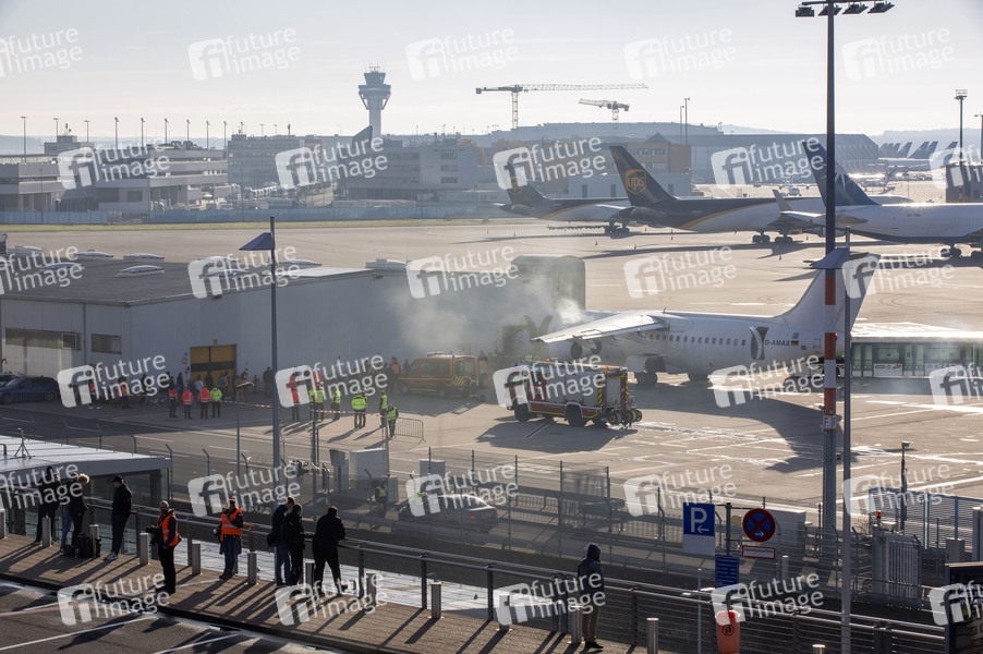 Explosion am Flugzeug bei der Notfallübung der Werkfeuerwehr, der Feuerwehr Köln und den Hilfsorganisationen am Flughafen Köln/Bonn. Im Rahmen der Übung wird die Kollision eines Flugzeugs mit einem Passagierbus und einer Abfertigungshalle simuliert. Einsatzkräfte retten aus dem in Brand geratenen Flugzeug und dem Gebäude Personen und versorgten diese. Köln, 06.11.2021