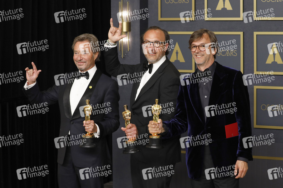 Patrick Wachsberger, Fabrice Gianfermi und Philippe Rousselet mit dem Oscar für den besten Film 'Coda' im Press Room der Oscar Verleihung 2022 / 94th Annual Academy Awards im Hollywood & Highland Center. Los Angeles, 27.03.2022