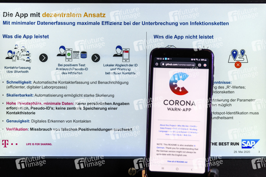 Telekom und SAP haben am 29.05.2020 die Corona-Warn-App vorgestellt. Im Bildhingtergrund die Powerpoint-Präsentation von Telekom und SAP
