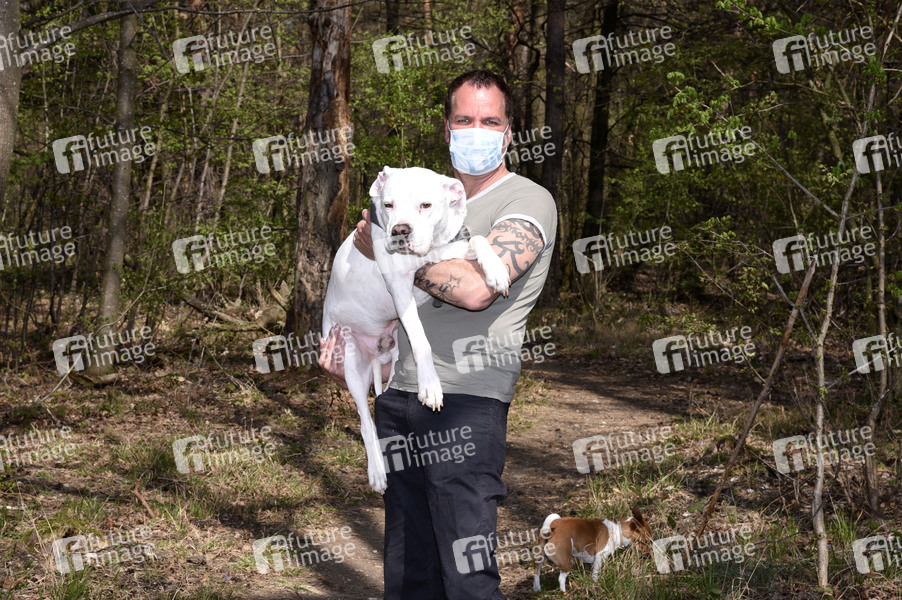 Dave Kaufmann mit seinem Hund Dean Martin und seiner Hündin Lieselotte bei einem exklusiven Fototerin während eines Spaziergangs. München, 17.04.2020