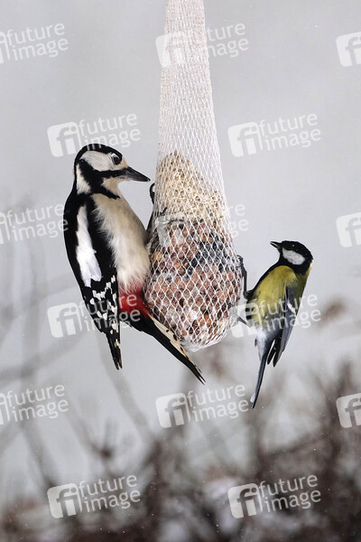 Buntspecht und Kohlmeise - Wer im Winter mit dem Füttern beginnt, sollte es auch konsequent und täglich bis zum Ende des Winters tun. Die Vögel verlassen sich auf ihre Futterplätze und könnten sonst in kürzester Zeit verhungern. (Symbolbild, Themenbild) Hannover, 07.02.2020