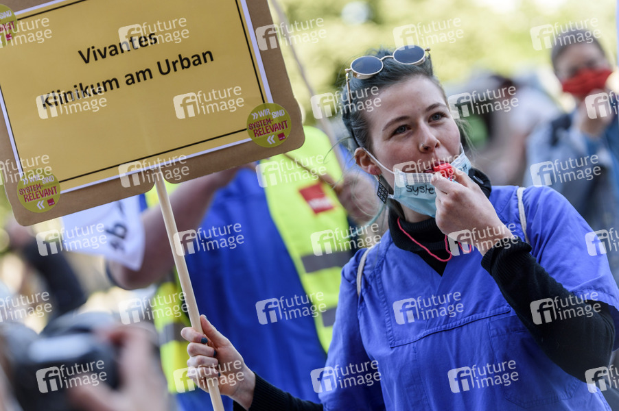 Beschäftigte der Charité und Vivantes-Krankenhäuser protestieren mit Verdi vor dem Roten Rathaus für mehr Schutz, Schutzausrüstung und Desinfektionsmittel. Sie fordern die sofortige Umsetzung des Volksentscheides für gesunde Krankenhäuser und einen 'Corona-Krankenhauspakt'. Berlin, 20.05.2020