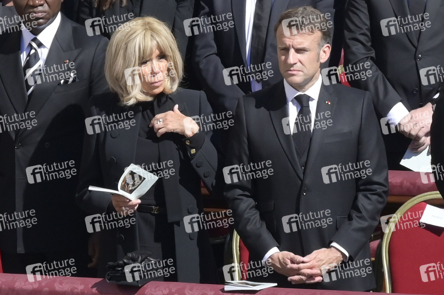 Emmanuel Macron mit Ehefrau Brigitte Macron bei der Trauermesse für den verstorbenen Papst Franziskus auf dem Petersplatz. Vatikanstadt, 26.04.2025