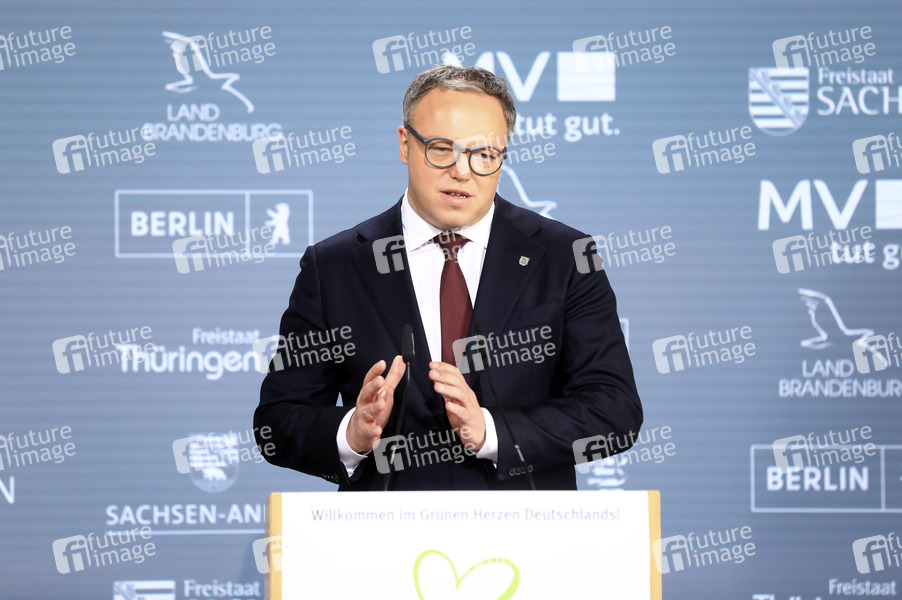 Mario Voigt bei der 53. Regionalkonferenz der Regierungschefin und der Regierungschefs der ostdeutschen Länder, der MPK-Ost, in der Vertretung des Freistaates Thüringen beim Bund. Berlin, 03.04.2025