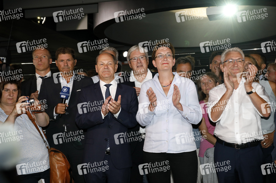 Olaf Scholz und Klara Geywitz bei der Wahlparty der SPD nach der Landtagswahl in Brandenburg im Bildungsforum Potsdam. Potsdam, 01.09.2019