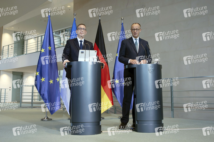 Kristen Michal und Friedrich Merz beim Empfang des Premierministers von Estland mit militärischen Ehren zu einem gemeinsamen Gespräch mit anschließendem Pressestatement im Bundeskanzleramt. Berlin, 27.11.2025