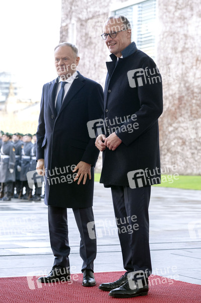 Friedrich Merz beim Empfang des polnischen Ministerpräsidenten Donald Tusk mit militärischen Ehren zu den 17. Deutsch-Polnischen Regierungskonsultationen im Bundeskanzleramt. Berlin, 01.12.2025