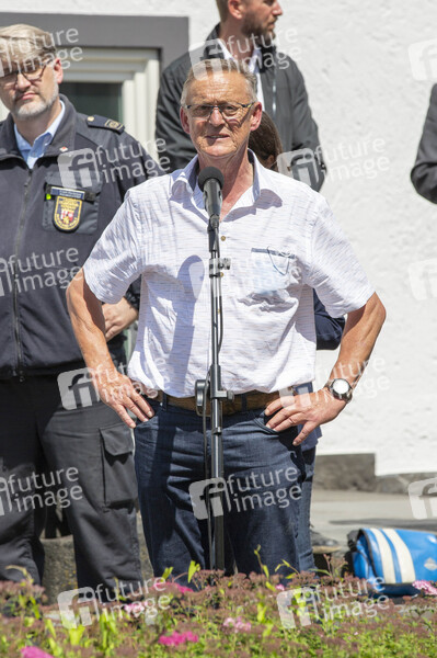 Helmut Lussi bei einem Pressestatement am Rathaus nach dem Besuch der Bundeskanzlerin im Eifeldorf Schuld, das schwer von der Unterwetterkatastrophe getroffen wurde. Adenau, 18.07.2021