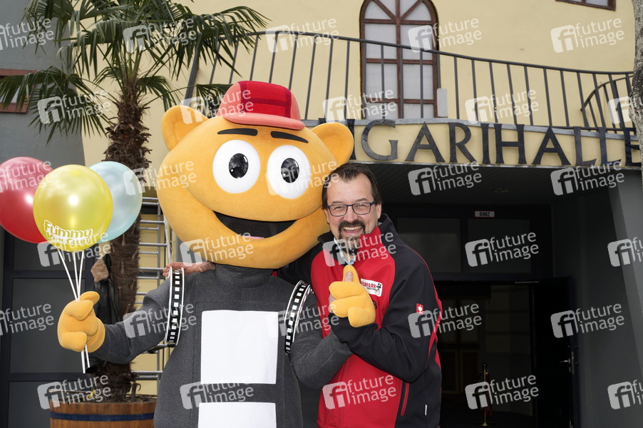Malte Schatz und Flimmy vor der Caligari Halle. Am 9. April öffnet der Filmpark seine Tore für die diesjährige Saison. Neben der Ausstellung 'Filmische Gesichter der Stadt Potsdam' und der Outdoor-Filmset-Tour, die im letzten Jahr entstanden sind, gibt es in der Caligari Halle die neue Schau 'Die Geschichte der Traumfabrik'. Die indoor geführte Filmset-Tour würdigt den legendären Standort. Potsdam, 07.04.2022