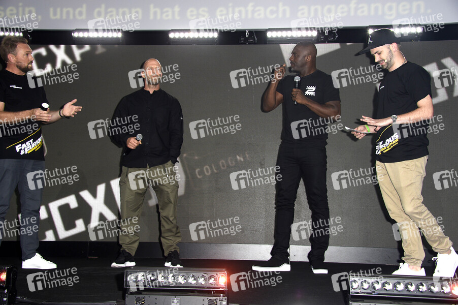 Steven Gätjen, Jason Statham, Idris Elba und Dominik Porschen bei der Weltpremiere des 3. Trailers zum Kinofilm 'Fast & Furious: Hobbs & Shaw' auf der CCXP Cologne 2019 auf dem Gelände der Koelnmesse. Köln, 28.06.2019