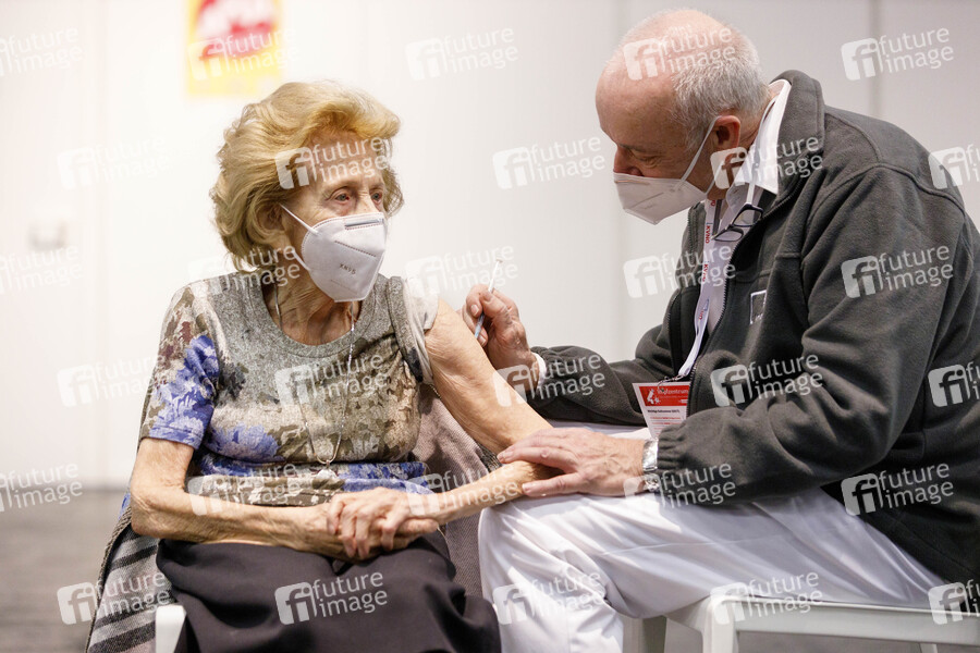 Das Kölner Impfzentrum in den Hallen der Koelnmesse hat eröffnet. Zuerst werden dort nun die Über-80-Jährigen geimpft – vorausgesetzt sie haben einen der Impftermine bekommen. Aufgrund der Verzögerung bei den Impfstoff-Lieferungen der Hersteller Biontech und Pfizer musste der Impfstart in NRW bis nun verschoben werden. Elisabeth Steubesand, mit 105 Jahren die älteste Kölnerin, war die erste Patientin, die im Impfzentrum ihre Impfung erhielt. (Themenbild, Symbolbild) Köln, 08.02.2021
