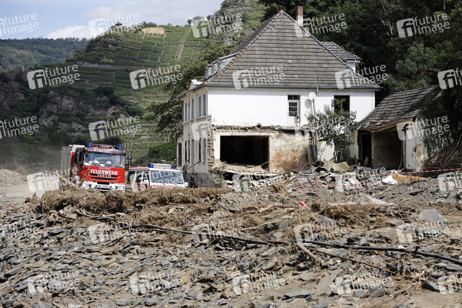 Nach dem Jahrhunderthochwasser in der Eifel durch heftige Regenfälle und Dauerregen mit Überschwemmungen und Überflutungen haben die Aufräumarbeiten im Ahrtal große Fortschritte gemacht. Einheiten von Polizei, THW, Bundeswehr und Feuerwehr mitsamt vielen freiwilligen Helfern haben Straßen geräumt, Schutt und Schlamm entfernt und die Menschen versorgt. Der Wiederaufbau wird trotzdem Jahre dauern. Im Bild Flutschäden bei der Ortschaft Mayschoß, in der die Flut viele Häuser zerstörte, 30.07.2021