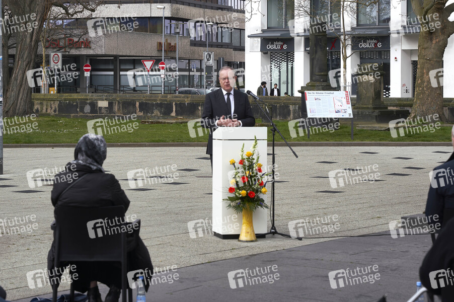 Stephan Weil bei einer Gedenkzeremonie für die Verstorbenen in der Corona-Pandemie vor der Nikolaikapelle an der Goseriede. Hannover, 18.04.2021