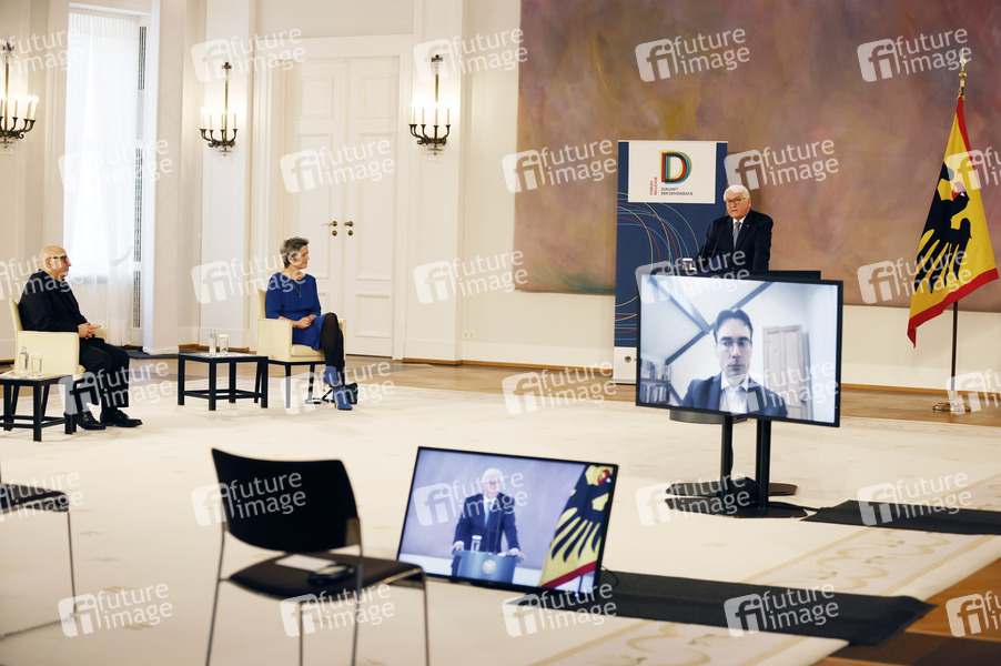 Armin Nassehi, Margrethe Vestager und Frank-Walter Steinmeier beim 11. Forum Bellevue: 'Demokratie und digitale Öffentlichkeit - Eine transatlantische Herausforderung' im Schloss Bellevue. Berlin, 01.03.2021