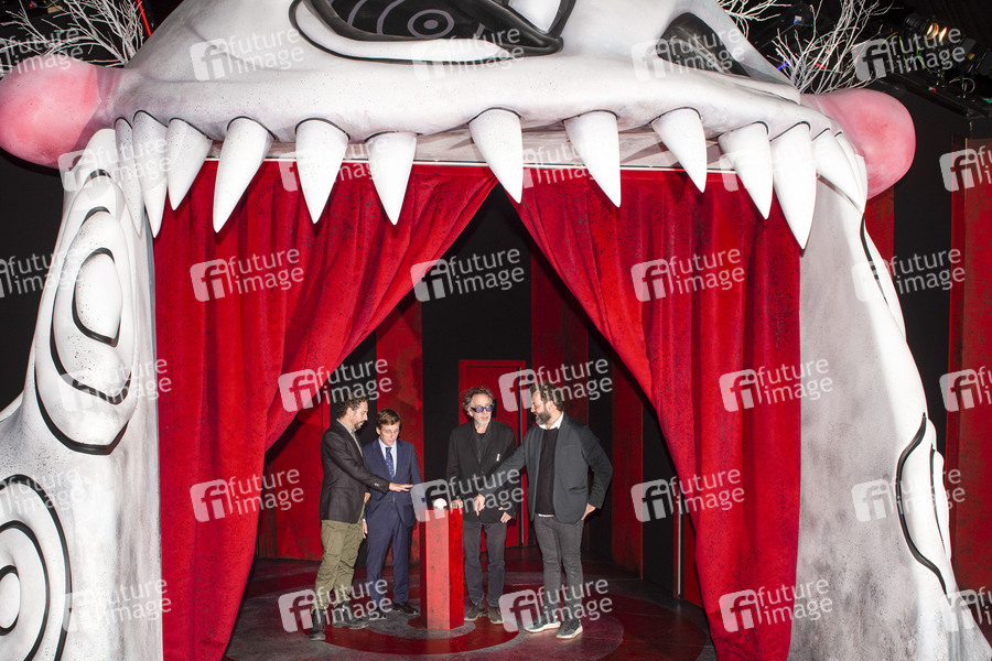 Paco Leon, Jose Luis Martinez-Almeida, Tim Burton und Inaki Fernandez bei der Eröffnung der Ausstellung 'Tim Burton - El Laberinto' im Espacio Ibercaja Delicias. Madrid, 28.09.2022