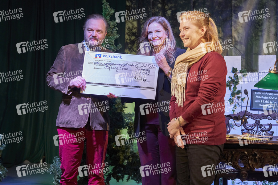 Alexander Fürst zu Schaumburg-Lippe und Rebecca Immanuel überreichen Andrea Bartl einen Scheck für die Stiftung Lesen beim 19. Weihnachtszauber auf Schloss Bückeburg. Bückeburg, 01.12.2022