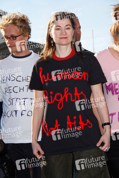 Flüchtlinge und Aktivisten, die vor dem Brandenburger Tor für eine neue Asylpolitik demonstrieren, werden von Politkerinnen der Piratenpartei unterstützt, Berlin