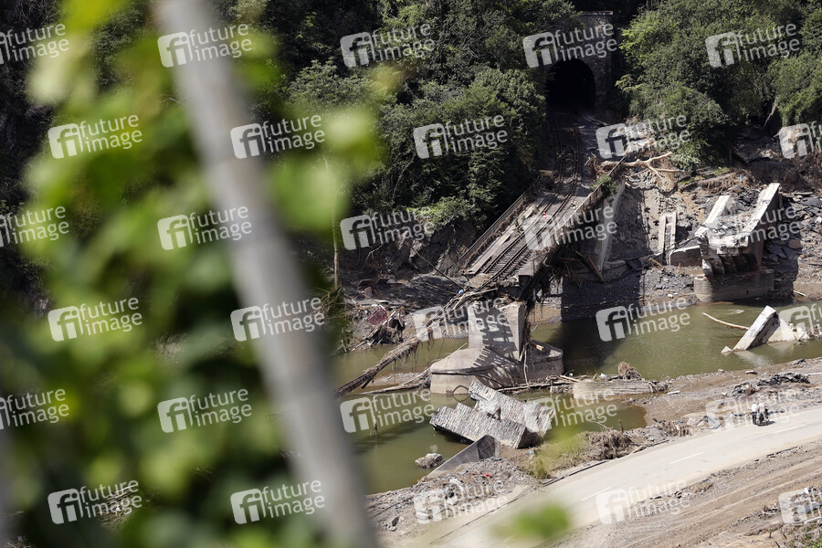 Nach dem Jahrhunderthochwasser in der Eifel durch heftige Regenfälle und Dauerregen mit Überschwemmungen und Überflutungen haben die Aufräumarbeiten im Ahrtal große Fortschritte gemacht. Einheiten von Polizei, THW, Bundeswehr und Feuerwehr mitsamt vielen freiwilligen Helfern haben Straßen geräumt, Schutt und Schlamm entfernt und die Menschen versorgt. Der Wiederaufbau wird trotzdem Jahre dauern. Im Bild Flutschäden an einer Eisenbahnbrücke nahe der Ortschaft Rech, in der die Flut viele Häuser zerstörte, 30.07.2021