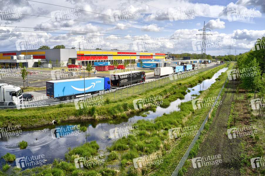 Amazon Logistik HAJ8, Logistikzentren, Lager, Versandzentrum, Luftaufnahme, Unternehmen, Versandhändler, Onlinehandel, Onlineversandhändler, Marktführer des Handels im Internet, Amazon.com. Marktmacht, Wirtschaft, Verteilzentrum, Sortierhallen. Lkw, Lastwagen