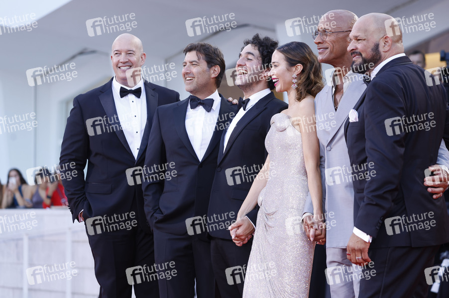 Hiram Garcia, David Koplan, Benny Safdie, Emily Blunt, Dwayne Johnson und Mark Kerr bei der Premiere des Kinofilms 'The Smashing Machine' auf der Biennale di Venezia 2025 / 82. Internationale Filmfestspiele von Venedig im Palazzo del Cinema. Venedig, 01.09.2025