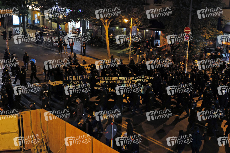 Demonstration gegen Räumung vom Wagencamp 'Köpi' von der Rigaer Straße zum Gelände des Camps an der Köpenicker Straße. Berlin, 09.10.2021