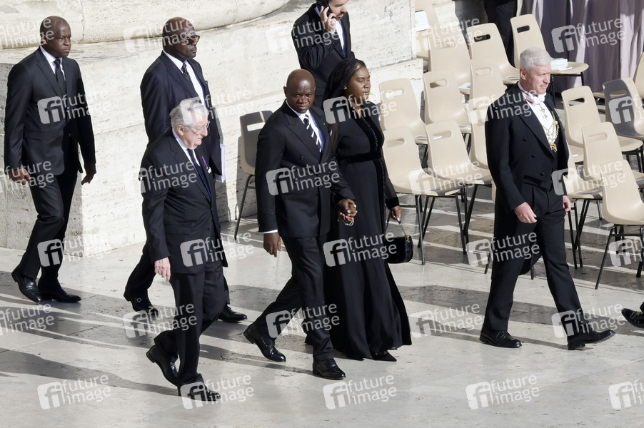 Brice Oligui Nguema mit Ehefrau Zita Oligui Nguema bei der Trauermesse für den verstorbenen Papst Franziskus auf dem Petersplatz. Vatikanstadt, 26.04.2025