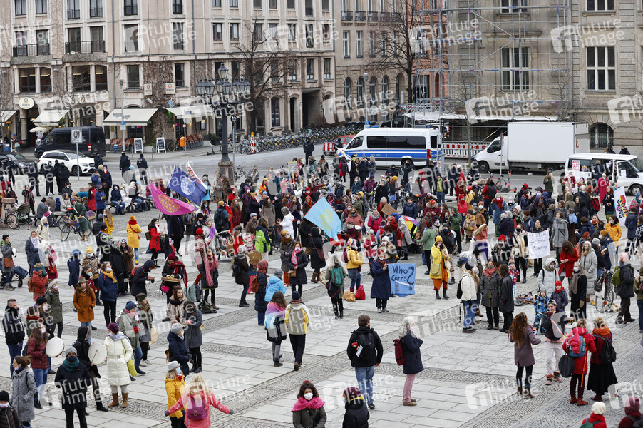 Unter dem Motto 'Gemeinsam in eine lebendige Zukunft' findet ein multikultureller Frauenmarsch vom Brandenburger Tor über das Rote Rathaus zum Gendarmenmarkt statt. Berlin, 28.02.2021