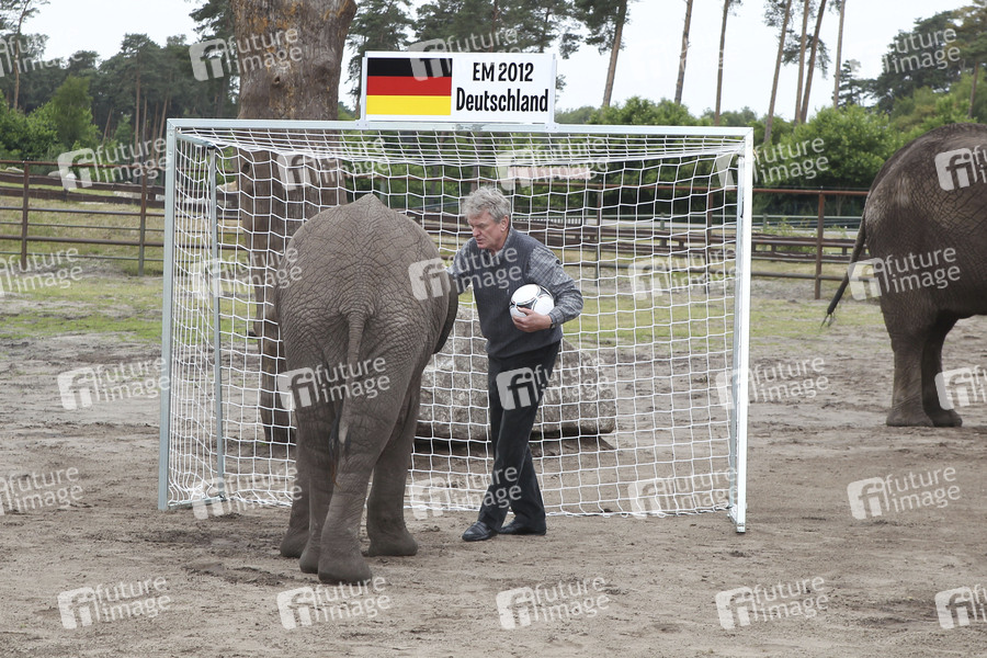 Start der Fan Fun Runde mit Elefantendame Nelly im Serengeti-Park, Hodenhagen. Gemeinsam mit Sepp Maier tippte Sie heute für das erste Spiel der deutschen Fußballnationalmannschaft gegen Portugal