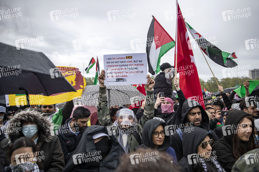 Tausende Menschen bei einem Protestmarsch, organisiert von pro-palästinensischen Organisationen. Viele Teilnehmer trugen Palästina-Fahnen und 'Free Palestine'-Banner. Ein Sprecher der Gruppe forderte die britische Regierung auf, ihre militärische, diplomatische und finanzielle Unterstützung für Israel umgehend einzustellen. London, 21.03.2021