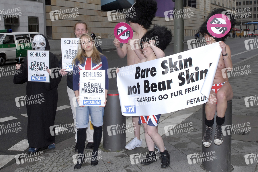 Demonstarion von Tierrechtlern vor der Britischen Botschaft in Berlin. PeTA Deutschland e.V. appelliert an die Queen Schluss mit dem Bärenfellmassaker für die Palastwache zu machen.
