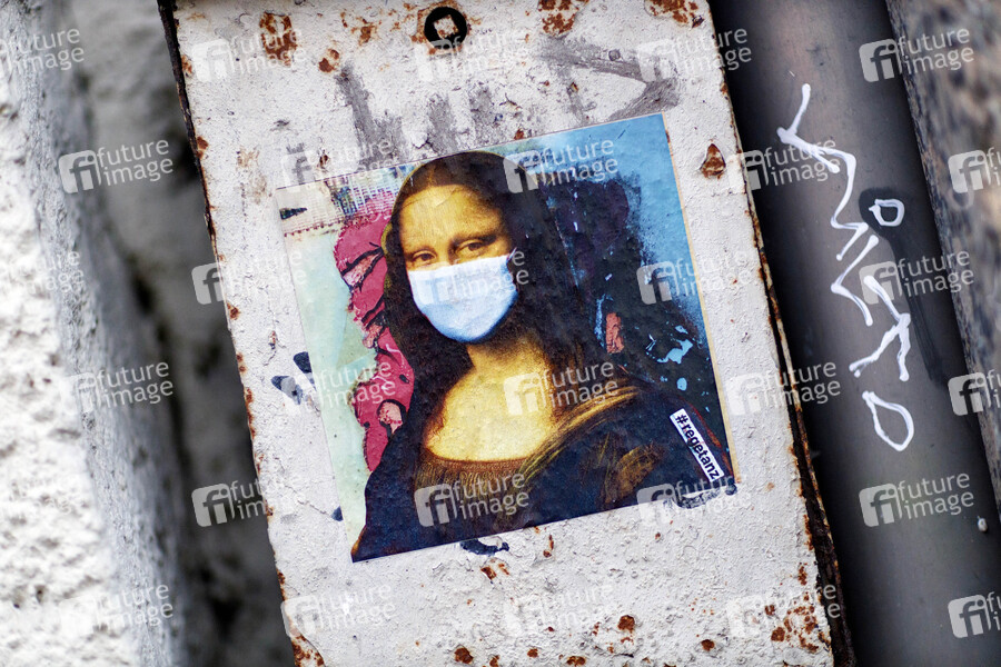 Die Kölner Künstlerin Ursula Düster hat einen Sticker mit der Kölschen Mona Lisa mit Mundschutz entworfen, der Aufkleber hängt an 60 Standorten in Köln anlässlich der Coronakrise. Köln, 31.10.2020