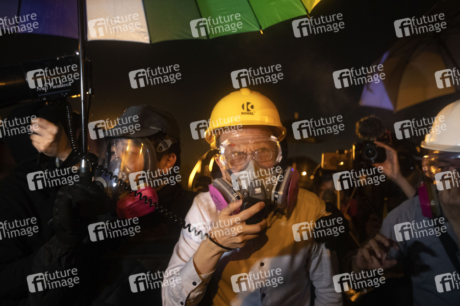 Der Präsident der chinesischen Universität von Hongkong, Professor Rocky S. Tuan, geht auf die No.2 Bridge und versucht,mit seinen Studenten zu sprechen - Kampf an der Chinese University Hong Kong (CUHK). Hongkong protestiert seit fünf Monaten ununterbrochen. Am Montag, dem 11. November 2019, begann ein Streik in der ganzen Stadt, der Teile von Hongkong zum Erliegen brachte, als MTR-Stationen geschlossen und mehrere Straßensperren errichtet wurden. Hongkong, 12.11.2019