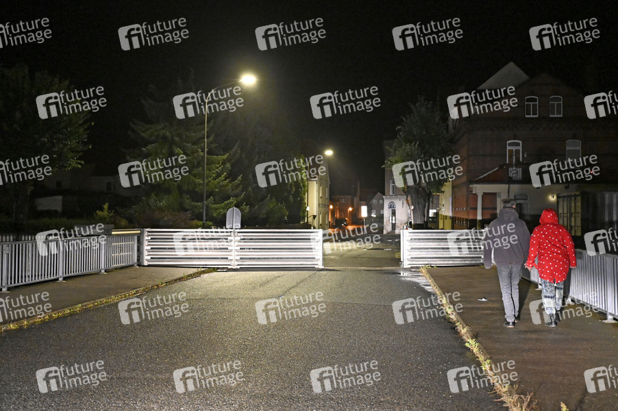 Die Lausitzer Neiße hat am 16.09.2024 um 08:15 Uhr einen von Wasserstand 557 cm und einen Durchfluss von 309 m3/s nach tagelangen Starkregen erreicht, was Alarmstufe 3 entspricht. Der Mühlgraben in Ostritz, nahe Görlitz, ist bis Brückenunterkante voll. Ostritz, 15.09.2024