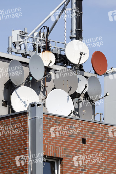 Satellitenschüsseln auf einem Dach in Köln. Mit Satellitenschüsseln lassen sich auch ausländische Programme in Deutschland empfangen. (Themenbild, Symbolbild) Köln, 26.08.2021