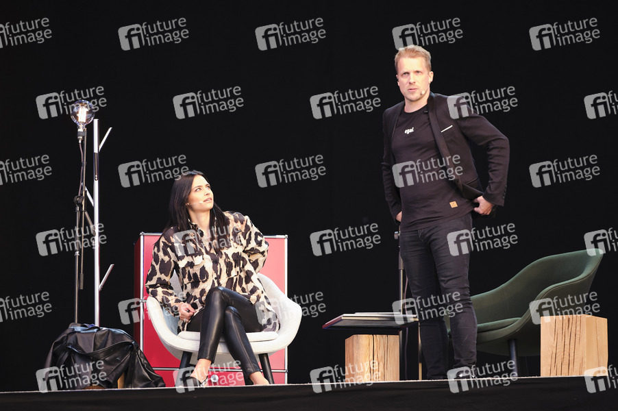 Oliver Pocher mit Ehefrau Amira Pocher bei der ersten Autokultur-Veranstaltung 'Die Pochers hier' auf dem Schützenplatz. Die Besucher verfolgen unter Berücksichtigung klarer Hygiene-Vorschriften während der Corona-Krise den Auftritt aus dem Auto. Hannover, 07.05.2020