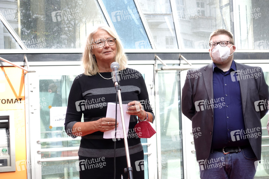 Angelika Noss und Michel Rieck bei der Pressekonferenz zum Erhalt des Kino Colosseums im Foyer vom Kino Colosseum. Berlin, 21.09.2021