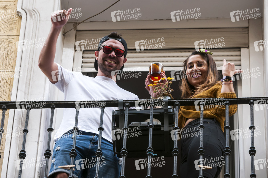 Nachbarschafts-Balkonparty in der Calle de las Maldonadas - Tag 35 seit Verhängung des Ausnahmezustands durch die spanische Regierung wegen der Coronakrise. Madrid, 18.04.2020