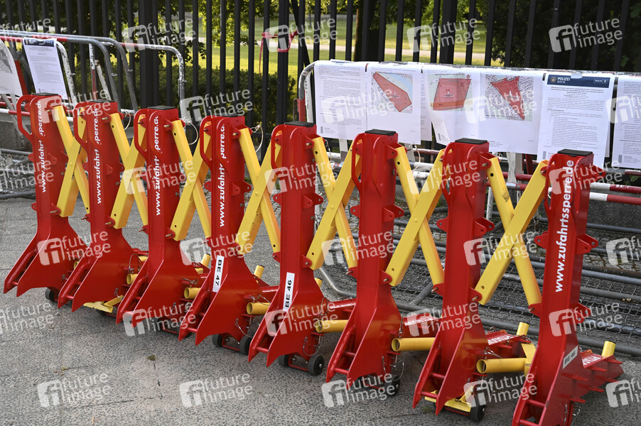 Zufahrssperren am Sowjetisches Ehrenmal Tiergarten. Mobile Sicherheitsperren werden von Institutionen wie Städten, Kommunen, Polizei, Militär und Regierungsbehörden gegen Fahrzeugattacken eingesetzt. (Symbolfoto, Themenfoto) Berlin, 08.05.2025