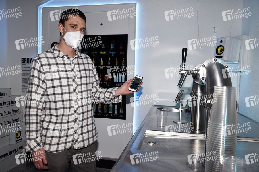 Andre Broy bei der Präsentation seiner digitalen Zapfanlage und der entsprechenden Handy-App. Im neuen Spätkauf BROY im Glockenbachviertel gibt es Bier und Getränke aus einem sprechenden animierten Automaten. Außerdem frisches Fassbier aus einer digitalen Anlage zum Selberzapfen. Die Idee dazu ist vergangenes Jahr während des Lockdowns entstanden. München, 03.02.2021