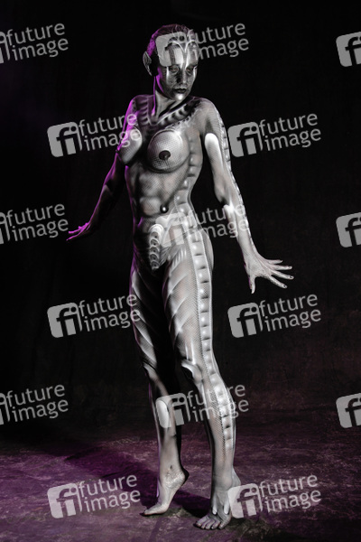 Bodypainting, Erotik, Frau, nackt, drinnen, weiblich, Monster, Außerirdische, Alien, Echse, Körperkunst, Kunst, Malerei, monochrom, erotic, woman, nude, indoor, female, monochrome, lizard, body art, body painting