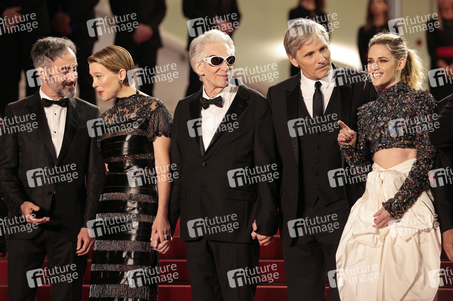 Don McKellar, Lea Seydoux, David Cronenberg, Viggo Mortensen und Kristen Stewart bei der Premiere des Kinofilms 'Crimes of the Future' auf dem Festival de Cannes 2022 / 75. Internationale Filmfestspiele von Cannes im Palais des Festivals. Cannes, 23.05.2022
