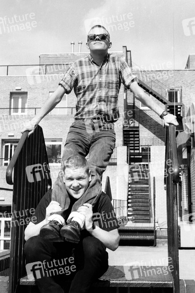 Steve Bronski und Larry Steinbachek von Bronski Beat bei einem Photoshooting auf dem Dach des PolyGram Records Gebäudes. London, 26.06.1984