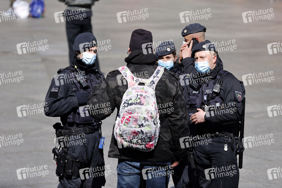 Am Rande einer unangemeldete Demo von Kritikern der Corona-Maßnahmen vor dem Kölner Dom führten Polizei und Ordnungsamt zahlreiche Kontrollen auf Einhaltung der Corona-Maßnahmen wie Mindestabstand und Maskenpflicht durch. Ab Montag will NRW wegen der steigenden Inzidenzzahlen noch strengere Corona-Regeln anwenden. Köln, 27.03.2021