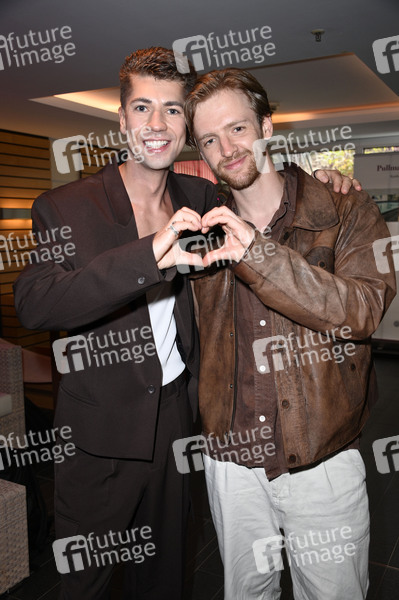 Maximilian Seitz und Timur Bartels beim Charity Promi Swim Event 2025 von Maximilian Seitz zugunsten von 'Kindeswohl-Berlin' im Hotel Pullman Berlin Schweizerhof. Berlin, 24.07.2025