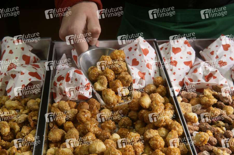Gebrannte Mandeln auf dem Weihnachtsmarkt 'Lichtenberger Winterzeit' an der Landsberger Allee im Berliner Bezirk Lichtenberg. Berlin, 03.11.2024