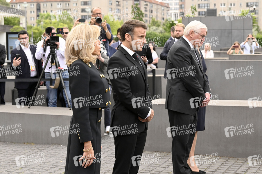 Brigitte Macron, Emmanuel Macron, Frank-Walter Steinmeier und Elke Büdenbender bei der Kranzniederlegung am Denkmal für die ermordeten Juden Europas. Berlin, 27.05.2024