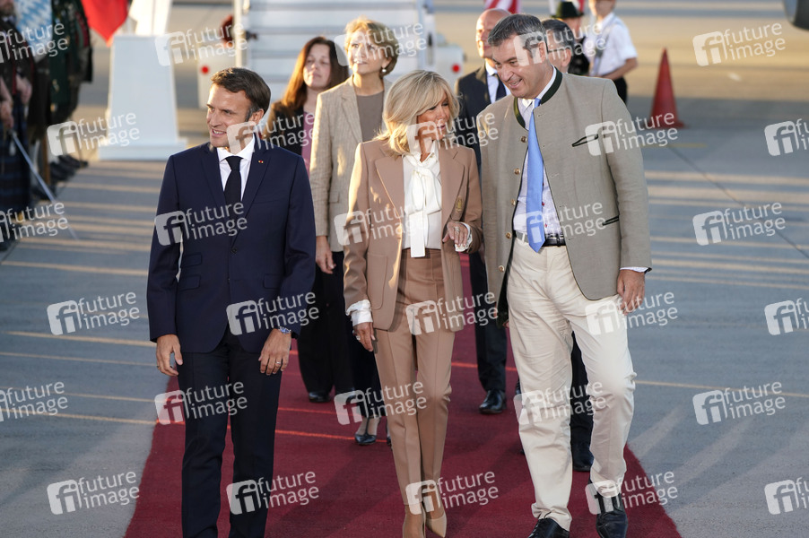 Emmanuel Macron mit Ehefrau Brigitte Macron und Markus Söder bei der Ankunft von Präsident Macron zum G7-Gipfel am Flughafen München Franz Josef Strauß. München, 25.06.2022