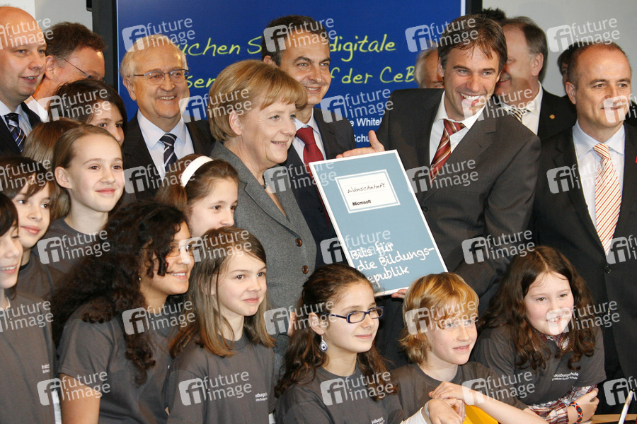 Eröffnungsrundgang von Bundeskanzlerin Merkel und Spaniens Ministerpräsident Zapatero auf der CeBIT 2010 (Centrum der Büro- und Informationstechnik), der weltgrößten Messe für Informations- und Computertechnik auf dem Messegelände in Hannover. Im digitalen Klassenraum von Microsoft