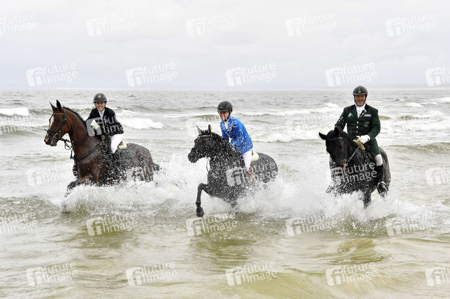 Janne Friederike Meyer-Zimmermann, Rhea Harder-Vennewald und Till Demtröder beim Defilée der Reiter und Hunde von Heringsdorf entlang des Strandes zur Seebrücke Ahlbeck. Usedom, 08.09.2019