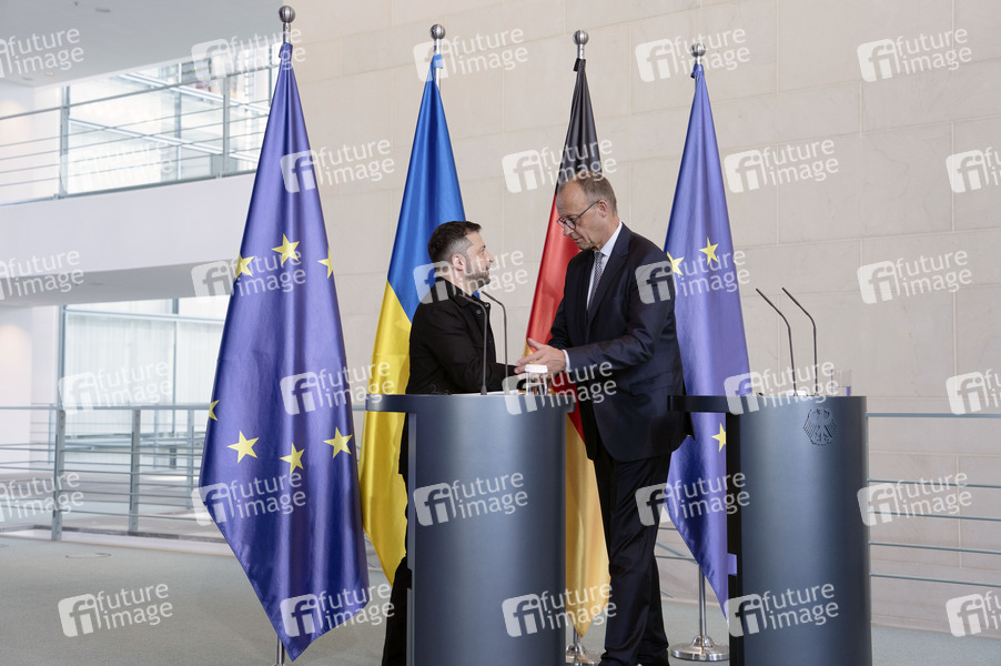 Wolodymyr Selenskyj und Friedrich Merz beim Pressestatement zum virtuellen Treffen zur Ukraine im Bundeskanzleramt. Berlin, 13.08.2025